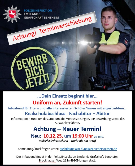 Am 10. Dezember 2025 sind Schüler*innen ab Klasse 9 sowie deren Eltern herzlich zu einem Informationsabend der Polizei in Lingen eingeladen! Der Abend dreht sich rund um den Polizeiberuf, die Voraussetzungen für das Studium, das Bewerbungsverfahren und den Ablauf des dreijährigen Bachelorstudiums. Die Einladung richtet sich auch an Lehrer*innen, die im Bereich der Berufsinformation tätig…