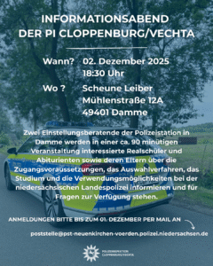 An diesem Abend nehmen sich zwei Einstellungsberatende Zeit, um Fragen zum Thema Zugangsvoraussetzungen/ Auswahlverfahren/ Studium/ Verwendungsmöglichkeiten zu beantworten. Anmeldung bitte per Mail an poststelle@pst-neuenkirchen-voerden.polizei.niedersachsen.de.