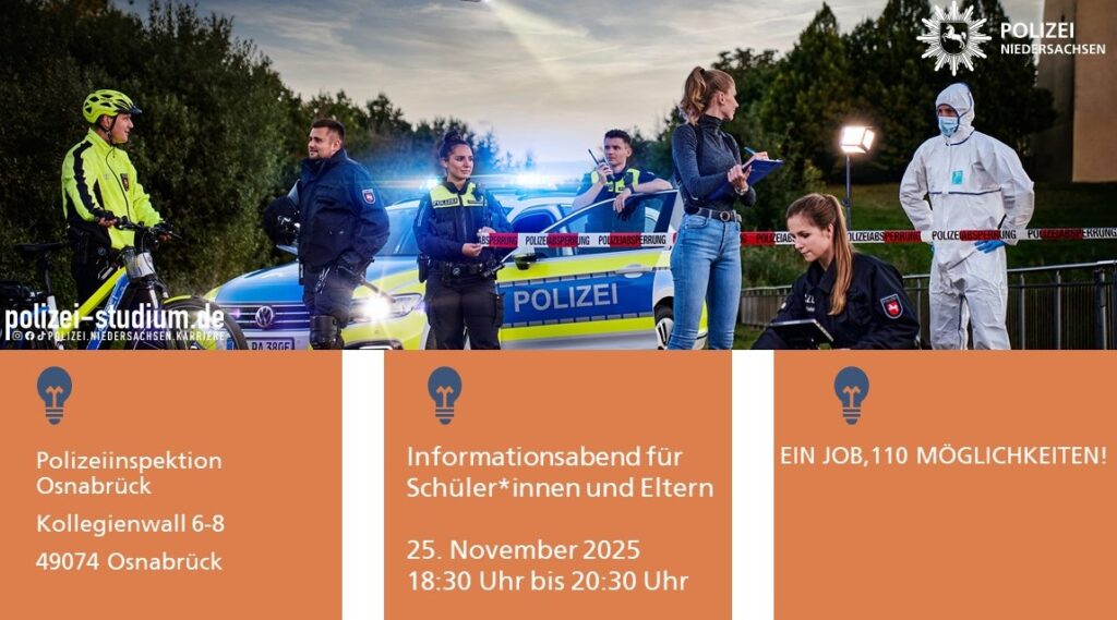 Am 25. November 2025 informieren die Einstellungsberater*innen der Polizei Osnabrück in der Zeit von 18:30 Uhr bis 20:30 Uhr über den Polizeiberuf und das Studium an der Polizeiakademie Niedersachsen. Dabei geht es um die Voraussetzungen, das Bewerbungsverfahren und den Ablauf des dreijährigen Bachelorstudiums. Insbesondere steht ausreichend Zeit für unbeantwortete Fragen von Eltern und Schüler*innen (ab Klasse 9) zur Verfügung.
